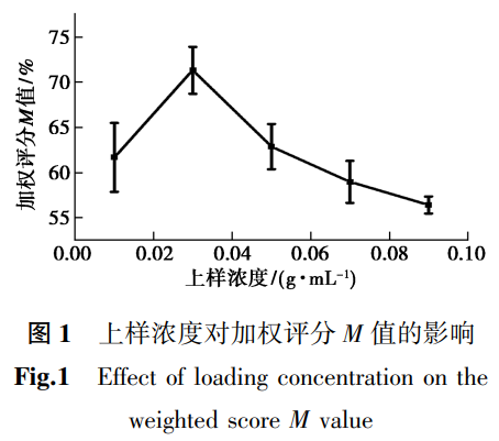 由图1可知,当上样浓度为0.03 g/mL时加权评分最高,得分为(71.33±2.60)%,根据实验结果可知随着上样浓度增加到一定程度后,加权评分M值降低,树脂对多糖的脱色率和脱蛋白率降低。