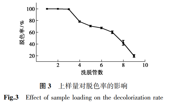由图3可知,当第5管时平均脱色率为(70.60±1.34)%,在第5管以后脱色率小于70%,推测当上样量达到一定程度时,树脂对色素的吸附量达到饱和,当增加上样量时造成脱色率的下降。