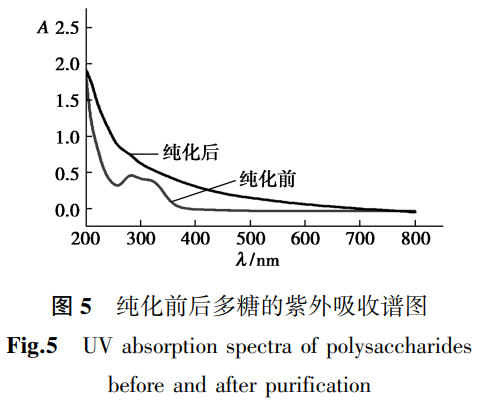 UV扫描谱图如图5所示,未纯化多糖在400 nm以下具有较强的杂吸收峰,并且在260和280 nm处有较强的吸收峰,表明粗多糖样品中存在较多蛋白质和核酸[23]、含有其它一些杂质,纯化后400 nm以下波长处的杂峰消失,说明经过XDA-1型大孔吸附树脂纯化后,蛋白质和核酸、其它杂质等被大量清除。