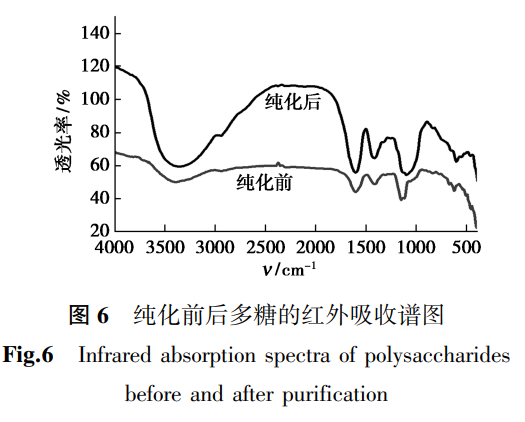 刺糖多糖纯化前后的FT-IR光谱图如图6所示,刺糖多糖纯化前后在3400 cm−1左右的吸收峰为—OH的伸缩振动。2930和1415 cm−1处的吸收峰为C—H振动吸收峰[24]。