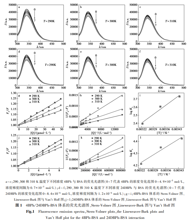 图1a ~ 1f展示了在290、300和310 K温度下不同浓度DBPs对BSA的荧光光谱的影响,其中激发波长设为280 nm时,波长范围设为300 ~ 500 nm。