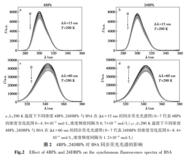 同步荧光光谱能够监测到蛋白质与配体相互作用时氨基酸残基的变化(其最大发射波长(λmax)的变化可以指示微环境的极性与疏水性的变化),因而被广泛用于分析配体对蛋白质的构象影响[33]。图2展示了温度为290 K条件下4BPh和24DBPh的同步荧光光谱。