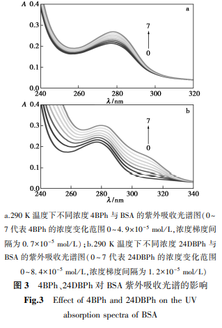 紫外可见光谱因其成本低、高效且操作简便等优点也成为配体对蛋白质构象的影响的有效工具[33]。从图3可以看出随着4BPh和24DBPh浓度逐渐增加,BSA在278 nm处的紫外吸收峰逐渐增强,并发生明显蓝移。