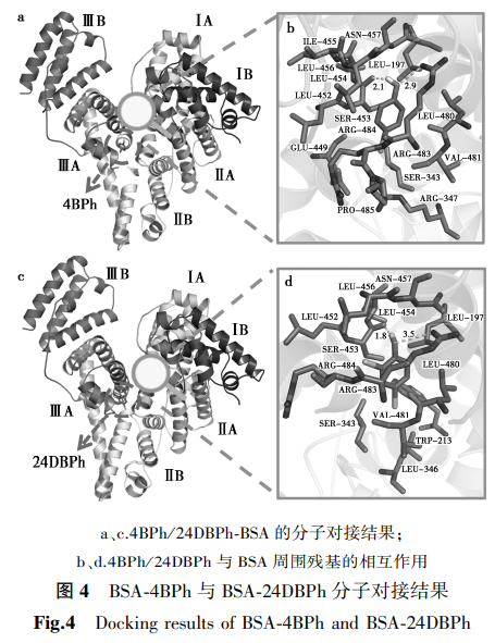 分子对接既能验证光谱实验结果,又能合理且直观地在分子水平上模拟配体与蛋白质的相互作用机制。根据以往研究结果表明BSA与配体的主要结合位点是亚结构域IIA与IIIA[35]。分子对接结果即4BPh、24DBPh与BSA结合的最稳定构象如图4所示。