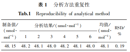 采用化学发光法[8]对氮气中一氧化氮标准气体进行分析,分析方法的重复性以样品6次重复分析结果的相对标准偏差来表示,分析方法重复性如表1所示。