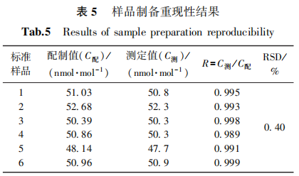 使用铝合金抛光气瓶制备6瓶浓度水平为50 nmol/mol、压力为10 MPa的氮气中一氧化氮标准气体,记录其配制浓度(C配,nmol/mol);放置48 h后测定其在42i-TLE型氮氧化物分析仪上的测定值(C测,nmol/mol)。样品制备重现性以单位浓度仪器测定值(R)的相对标准偏差来表示,结果如表5所示。