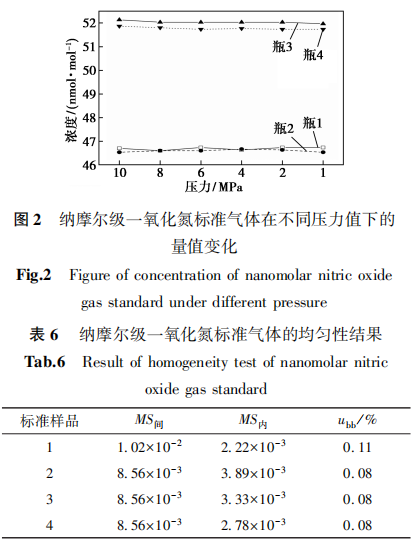 本研究制备了4瓶浓度水平为50 nmol/mol、压力为10 MPa的氮气中一氧化氮标准气体,用于考察样品的瓶内均匀性。图2为制备的一氧化氮标准气体在10、8、6、4、2、1 MPa压力下的量值变化图,表6为一氧化氮标准气体由不均匀引入的不确定度。