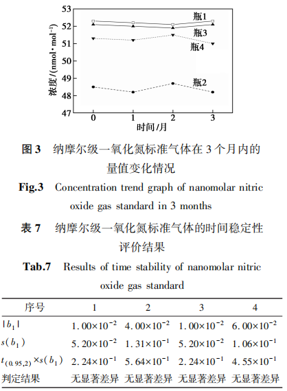 本研究制备的氮气中一氧化氮标准气体(50 nmol/mol)具有良好的制备重复性、瓶内均匀性和时间稳定性;