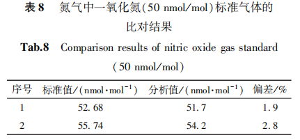 由于目前国内外尚无同等浓度水平的标准气体,为验证本研究制备的氮气中一氧化氮(50 nmol/mol)标准气体量值准确性,采用具有国家标准样品编号的氮气中一氧化氮标准气体(标准样品编号:GSB 07-1406-2019,标准值为28.90 µmol/mol,相对扩展不确定度为3%),经动态稀释仪稀释。动态稀释仪(146i型)配有除氧装置,经稀释后浓度为50 nmol/mol,对42i-TLE型痕量一氧化氮分析仪进行校准,并对研究制备的2瓶氮气中一氧化氮(50 nmol/mol)标准气体进行分析测试。结果如表8所示。