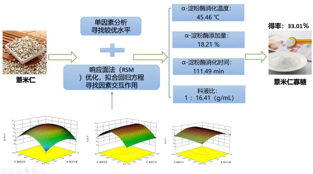 薏苡仁是传统药食两用植物,其中活性成分的获得研究主要集中在蛋白质、淀粉、多糖、油脂方面,而薏苡仁寡糖却并未深入报道。寡糖具有调节肠道的酸性环境,促进肠内矿物质吸收和益生菌繁殖等功效,是天然产物高效利用的难题。微波由电磁波与极性分子相互作用,穿透物质后进行偶极旋转产生热量,实现快速加热提取;超声波则通过空化气泡引起的机械效应增强溶剂渗透到细胞多孔表面的能力,在较低温度下提高产量;超声-微波辅助提取(UMAE)不仅适当地结合了两种技术的优点,且弥补了各自的不足。文章通过响应面法优化酶协同微波-超声波技术辅助制备薏苡仁寡糖,具有提高得率和降低成本的潜力。