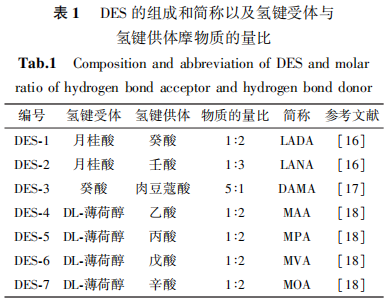 在绿色萃取技术中,具有低黏度的溶剂具有更强的优势。近年来,离子液体成为广泛关注的萃取溶剂[24]。但是,由于其黏度很高,往往通过添加水或有机溶剂等助溶剂来降低黏度,限制了其在萃取领域的功能[25]。低共熔溶剂因成本低、易降解等特性,被普遍认为是替代离子液体的理想溶剂,但是其黏度仍然普遍很高。从图2d中可以看出,本研究的7种低共熔溶剂黏度均低于10 mPa·s,与离子液体和常见低共熔溶剂相比,显示出理想的流动性,具有作为良好萃取溶剂的潜力。