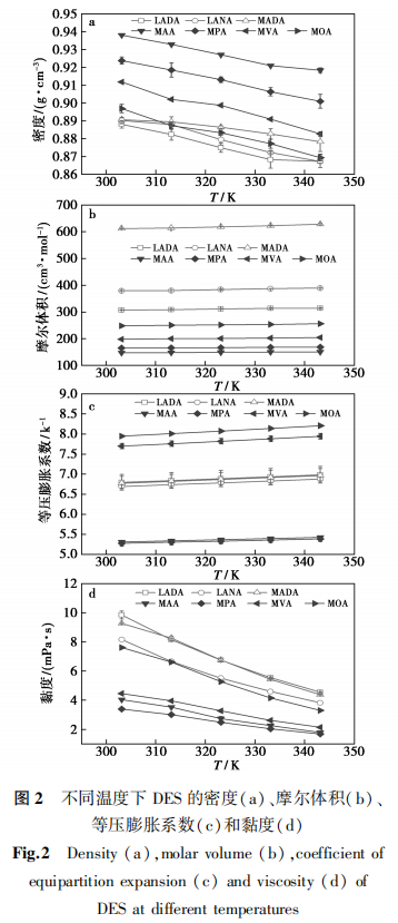 低共熔溶剂的密度取决于分子的组织和堆积,并且受液体中空穴和空位的影响[20]。测定7种低共熔溶剂在303.15 ~ 343.15 K温度范围内的密度,结果如图2a所示。7种低共熔溶剂的密度均小于水,密度范围为0.8673 ~ 0.9381 g/cm3。根据“空穴”理论,热能在局部密度上产生涨落,所以低共熔溶剂液体中离子运动和自由体积的增加导致低共熔溶剂密度随温度的升高而降低。本文研究结果与朱俊芳等[21]研究规律相似,即温度越高,低共熔溶剂的密度越小。温度也是影响分子摩尔体积(Vm)的重要因素。如图2b所示,当温度升高时,低共熔溶剂分子热运动加速,分子间缔合减弱,分子距离增大,摩尔体积增大。除此之外,低共熔溶剂自身的结构也是摩尔体积变化的主要原因。2.1.3 等压热膨胀系数