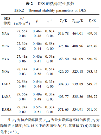 Kamlet-Taft参数用于表示溶剂中的氢键相互作用、分散相互作用和静电相互作用,包括α(给予质子的溶剂容量)、β(接受质子的溶剂能力)和π*(偶极性/极化率)[34]。疏水性低共熔溶剂的极性主要取决于HBA的性质。表2总结了303.15 K下7种低共熔溶剂的极性参数。2.1.7 热稳定性