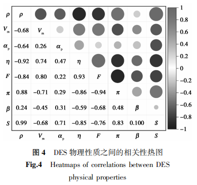 Cablé等[43]的研究中发现n(辛酸) : n(薄荷醇)=2:1低共熔溶剂对酚类化合物表现出最高的提取效率,且密度更高。同样,Fan等[44]筛选出的n(薄荷醇):n(1-丁醇)=1:1从雨生红球藻中提取紫杉烷的回收率超过95.31%,相比之下该低共熔溶剂也表现出较高的密度和较低的黏度。为了研究低共熔溶剂各物理性质与虾青素溶解度之间的相关性,绘制了低共熔溶剂性质数据与虾青素溶解度数据关联系数热图,结果见图4所示。