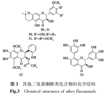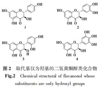 天然二氢黄酮醇类化合物中常见的简单结构有二氢山奈酚、二氢槲皮素、二氢桑色素和二氢杨梅素等(结构见图2),它们的取代基仅为羟基。