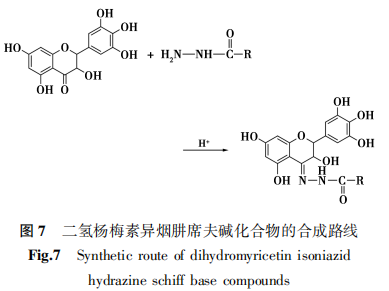 酰腙类Schiff碱化合物是一类具有较好生物活性的药物配体,郭芳等[70]利用二氢杨梅素与异烟肼以乙醇为溶剂、冰乙酸调节pH合成了二氢杨梅素异烟肼席夫碱化合物(见图7),并采用正交试验,考察不同反应条件对产率的影响 ,最后得出的最优条件是:温度为55 oC,pH 5.5,反应时间为7 h。