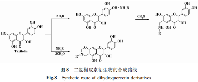 有报道利用二氢槲皮素在甲醛与仲胺下发生曼尼希二烷基胺甲基化反应(Mannich dialkylaminomethylation),改善了其水溶性,Kukhareva等[71]修改该合成方法,利用二氢槲皮素与伯胺进行反应得加合物,这些加合物在反应物等物质的量下短时间接触后形成,并自发沉淀,后再用该加合物在异丙醇下与甲醛继续反应得C-6上连接胺的衍生物,且作者在两倍过量甲醛下使二氢槲皮素与伯胺反应时,发现形成了杂环片段(见图8)。