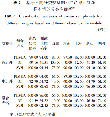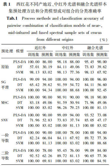 多种预处理方式(SG平滑、SNV、MSC、D1、D2)结合多种模式识别方法(PLS-DA、DT、SVM)实现了不同产地西红花的准确识别;