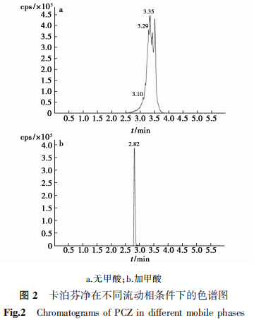 为了改善分离度和峰形,本方法通过改变流动相的pH来改善。采用5 mmol/L乙酸铵-0.1%甲酸的水溶液为流动相A,0.1%的甲酸乙腈溶液为流动相B,添加乙酸铵是为了增加响应较低的伊曲康唑和羟基伊曲康唑的灵敏度;选择添加甲酸,是为了改善卡泊芬净的色谱峰形,在A相和B相中同时添加同浓度的甲酸,是为了保证在A相和B相任意比例混合时,始终保证体系在相同的酸碱度下进行分离,色谱分析更稳定。图2中a为流动相中未加酸的卡泊芬净的色谱峰,b为流动相中添加甲酸后的卡泊芬净的色谱峰,由图可知,添加甲酸可改善卡泊芬净的峰形。