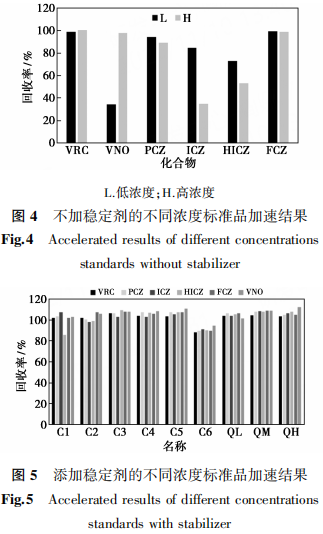 由于基质的添加,标准品和质控物的稳定性存在一定问题,图4为不加任何稳定剂的两种浓度的标准品加速结果,伏立康唑氮氧化物、伊曲康唑等响应降低。