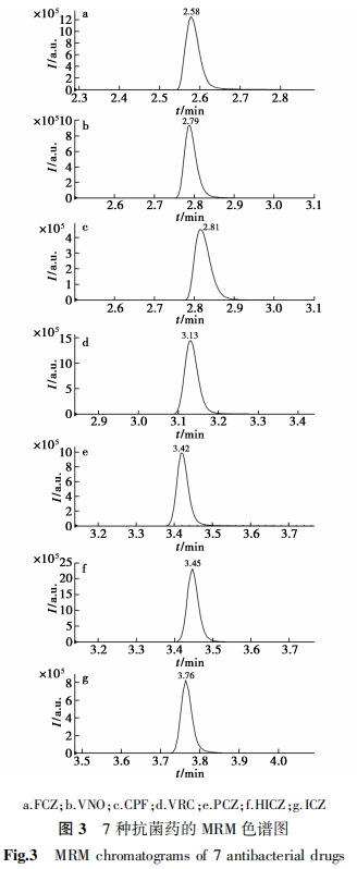 标准储备液的配制:准确称取适量VRC、VNO、PCZ、ICZ、HICZ、FCZ、CPF标准品,用甲醇分别溶解并配制成浓度为1 mg/mL的标准储备液。分别移取不同体积的储备液于同一容量瓶中,配制成混合标准溶液。储备液于-80 ℃冰箱中保存,混合标准溶液于-20 ℃冰箱中保存。1.5 定量方法