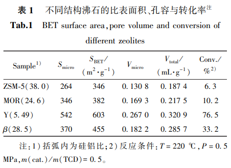 环戊二烯二聚体(DCPD)在RaneyNi催化剂上饱和加氢后得到的TCD主要为endo构型异构体,exo构型异构体含量低于2.5 wt%[37]。选择4种常规的沸石为催化剂,以endo构型异构体为反应物,如表1所示,在ZSM-5(38.0)与MOR(24.6)沸石上,endo-TCD的转化率分别为6.3%与10.2%。