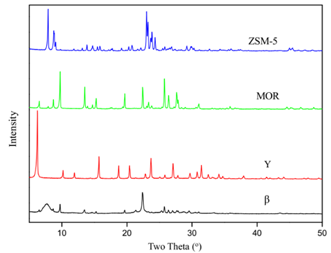 如图1所示,XRD图谱表明4种沸石催化剂分别具有相应结构的特征衍射峰。如图2所示,从NH3的脱附曲线可以看出,4种沸石均具有较高的酸量,从NH3脱附温度看出,MOR与ZSM-5具有更高的脱附温度,表明这2种沸石上具有更强的酸性位。