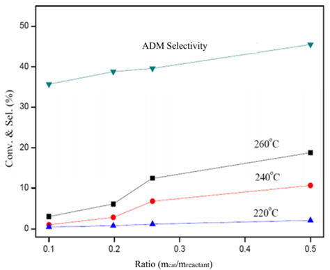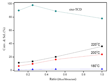 Fig.3 Influence of temperature and mass ratio of catalyst to endo-TCD