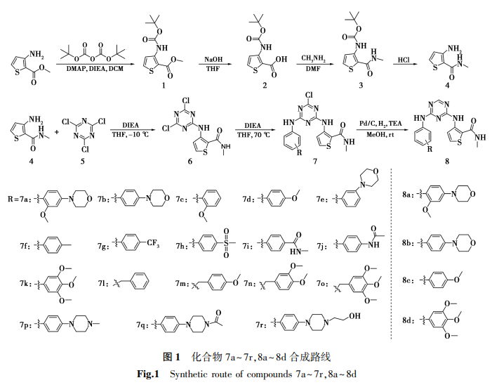 本文共合成新化合物22个,目标化合物(7a ~ 7r)和化合物(8a ~ 8d)的合成路线如图1所示。最初,3-氨基噻吩-2-羧酸甲酯与二碳酸二叔丁酯反应,得到产率为60%的化合物1。在NaOH溶液存在下,化合物1水解为羧酸得化合物2,产率为90%。随后,化合物2与甲胺盐酸盐反应得到95%产率的化合物3。在盐酸-乙酸乙酯溶液的帮助下,化合物3的Boc基团被脱保护,得到关键中间体4。