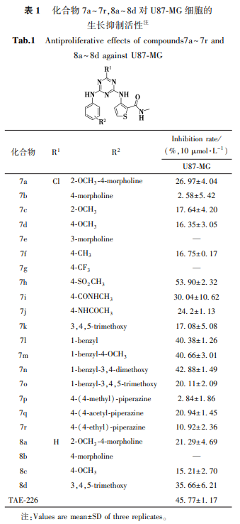 总之,我们合成了一系列新型的含噻吩片段的1,3,5-三嗪衍生物,并且评价了它们的体外抗肿瘤活性。其中,化合物7h在U87-MG肿瘤细胞测试中表现出比TAE-226更有效,IC50值为 9.528 µmol/L。该设计为三嗪类衍生物的开发提供了一种新的选择,该设计为三嗪类衍生物的开发提供了一种新的选择,我们将对化合物7h进一步研究。