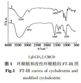 图1为环糊精(β-CD)和改性环糊精(CMCD)的FT-IR图。从图中可以看出,β-CD在3350 cm-1为-OH的伸缩振动峰,2931 cm-1为C—H键的伸缩振动峰,1650、1420和1026 cm-1等为C—O键的伸缩振动峰。