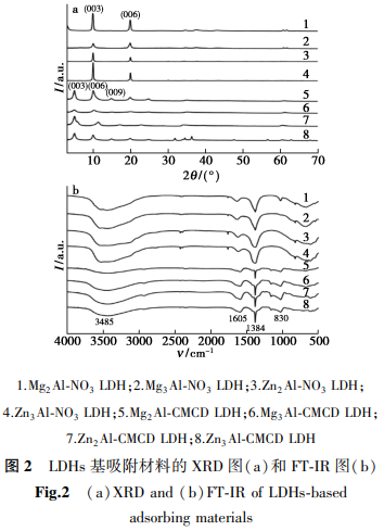 图2a为LDHs基吸附材料的X射线衍射图。从图中可以看出,合成的NO3-LDHs(曲线1~4)在2θ角为10.0°、20.0°处分别出现了特征的(003)和(006)衍射峰,峰形对称,半峰宽较窄,而且没有其他杂质峰,证明合成的不同金属离子NO3-LDHs具有较好的晶型结构。图2b为LDHs基吸附材料的FT-IR图。从图中可以看出,不同金属离子NO3-LDHs在1384 cm-1处均出现了NO3-的伸缩振动峰(曲线1~4),证明水滑石层间存在NO3-,而未在1360 cm-1处发现明显的吸收峰,说明层间不存在CO32-。