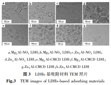 图3为LDHs基吸附材料的TEM图。从图中可以看出,合成的NO3-LDHs(图3a ~ 3d)均呈现出典型水滑石六方片状结构,尺寸在40 ~ 120 nm范围内。
