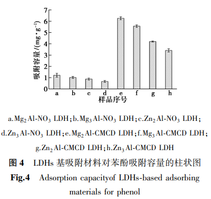 图4是LDHs基吸附材料对苯酚的吸附平衡时的容量图。从图中可以看出,CMCD插层在水滑石层板间大大提高了其对苯酚的吸附性能,吸附量从0.67 ~ 1.22 mg/g提升到3.42 ~ 6.27 mg/g,这是由于CMCD空腔尺寸与苯酚分子大小相近,结构含有羟基能与苯酚形成氢键,从而显著增大苯酚的吸附能力。