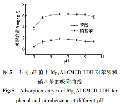 由于Mg2Al-CMCD LDH对苯酚吸附效果最佳,因此进一步探究不同pH值条件下Mg2Al-CMCD LDH对苯酚(硝基苯)的吸附能力,由图5可以看出,pH 6 ~ 8范围内苯酚(硝基苯)吸附量较为稳定,当pH 6时,对苯酚的吸附容量最大,为6.27 mg/g;当pH 6时,对硝基苯吸附量最大,为1.80 mg/g。