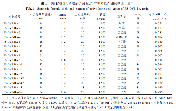 通过工艺调节,合成了一系列活性硼酸基团含量不同的树脂;