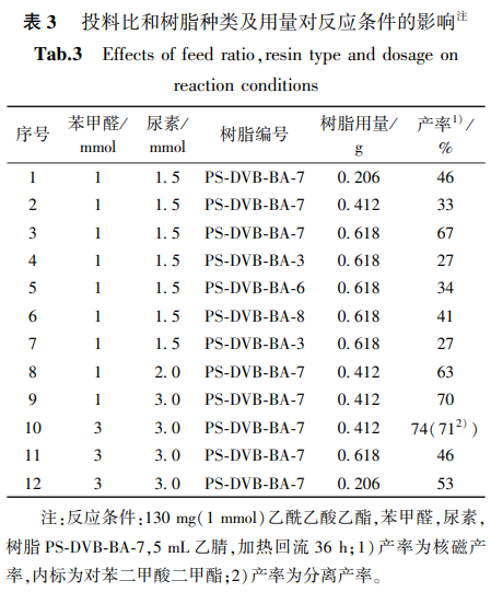 3.2 PS-DVB-BA树脂对Biginelli反应具有较好的催化活性,其催化乙酰乙酸乙酯、苯甲醛与尿素反应的最优条件为:以PS-DVB-BA-7树脂为催化剂,乙腈为溶剂,在催化剂的用量为0.412 g/(1 mmol 乙酰乙酸乙酯),苯甲醛与尿素用量均为乙酰乙酸乙酯的3倍,回流36 h,该条件下,产率高达71%。