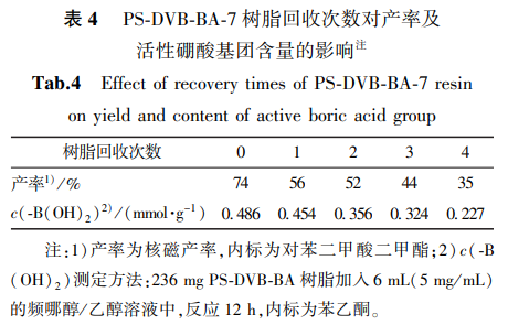 3.4 多次回收使用树脂,树脂活性硼酸基团含量降低,但仍具有一定的催化活性。因此,该树脂具有一定的重复使用价值。