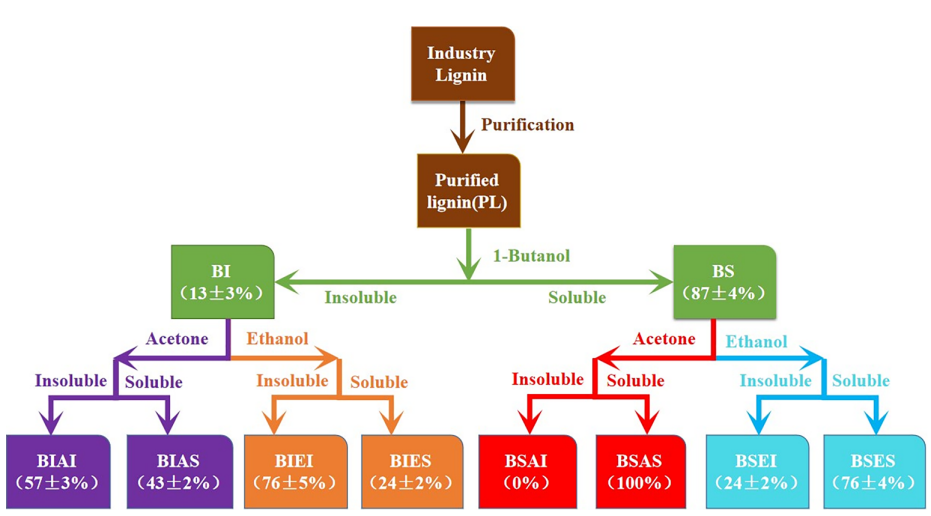 溶剂在固体或液体表面挥发,可以诱导分子和纳米粒子等自组装成有序结构[19],具有操作简单和可调控等优点。Jiang等[20]通过粗碱木质素与1-丁醇混合溶解并经过有机分馏、离心,再分别与乙醇、丙酮和四氢呋喃混合,去除有机溶剂制备微球(分馏流程图见图1)。