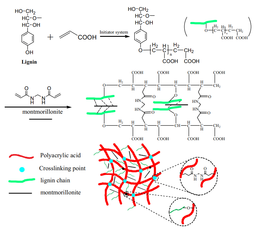 Sun等[33]采用小麦秸秆中提取的木质素和2-甲基环戊二烯三羰基锰反应,以过硫酸钾和无水亚硫酸钠作为氧化还原引发剂,成功将聚丙烯酸接枝到木质素上,并得到了三维网络结构的水凝胶(制备过程见图3)。