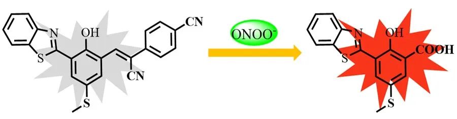 过氧亚硝酸盐(ONOO−)作为一种重要的生物活性氧(ROS),由体内一氧化氮和超氧化物的扩散控制反应产生。正常浓度范围的ONOO−对细胞功能产生积极影响,如信号转导、氧化还原稳态和免疫反应。截至目前为止,有许多分析方法用于ONOO−检测,如紫外-可见光谱、电子自旋共振、电化学分析、免疫组织化学、和荧光法。相比之下,荧光法具有非入侵、选择性高、响应快速、超时空成像等优势,被认为是一种非常有效的方法。