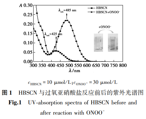 首先,借助紫外吸收光谱考察HBSCN对ONOO−识别能力。如图1所示,在PBS缓冲溶液(V(DMF): V(H2O)=1:9, 10 mmol/L, pH 7.4)中,HBSCN自身在425 nm处有一个明显的紫外吸收峰。