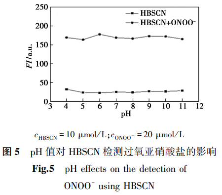 pH值是一个重要的实验参数。为探讨HBSCN是否能够在生物体中实现对ONOO−的检测,在不同的pH溶液中,我们测试了HBSCN对ONOO−响应情况。如图5所示,在pH 4 ~ 11之间,HBSCN自身的荧光强度几乎不变,说明HBSCN在不同的pH值下具有较好的稳定性。