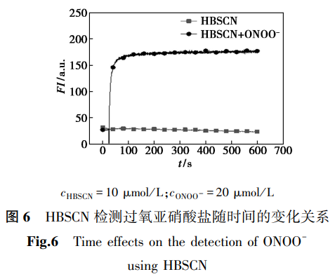 HBSCN 对ONOO−的响应时间是另外一个重要的实验参数。为探讨HBSCN对ONOO−检测的动力学,我们测试了HBSCN在不加和加入ONOO−后荧光强度变化与时间的关系,如图6所示,HBSCN本身的荧光强度不随时间的变化而变化。