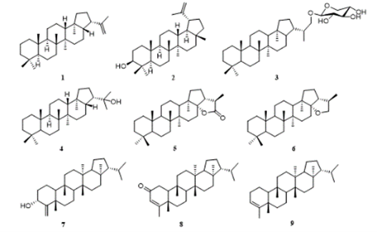 萜类化合物是一类主要来自植物的天然化合物,一般由异戊二烯(C5)单元组成,根据其数量可分为半萜类化合物(C5)、单萜类化合物(C5)、倍半萜类化合物(C15)、二萜类化合物(C20)以及三萜类化合物(C30)[25, 26],目前从桫椤中共分离得到了18个萜类化合物。