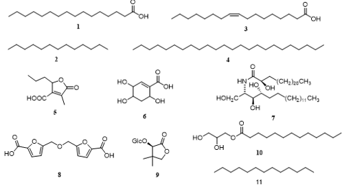 此外,文献报道了桫椤中分离得到的18个其他类的化合物,主要包括有机酸类、脑苷脂类、脂肪烃类等。以上化合物均来源于桫椤茎。