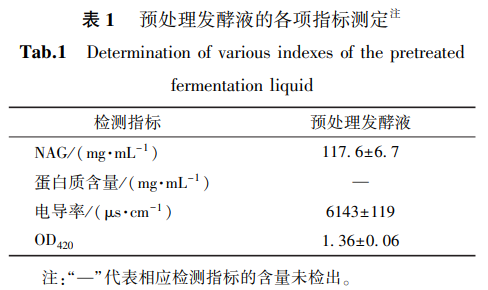 采用超滤膜对NAG发酵液进行预处理,收集超滤膜透过液并以NAG、蛋白质含量、电导率、OD420为检测指标进行测定,结果如表1所示。