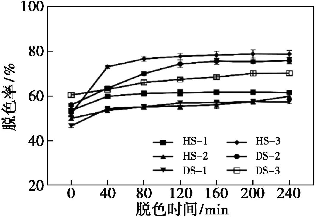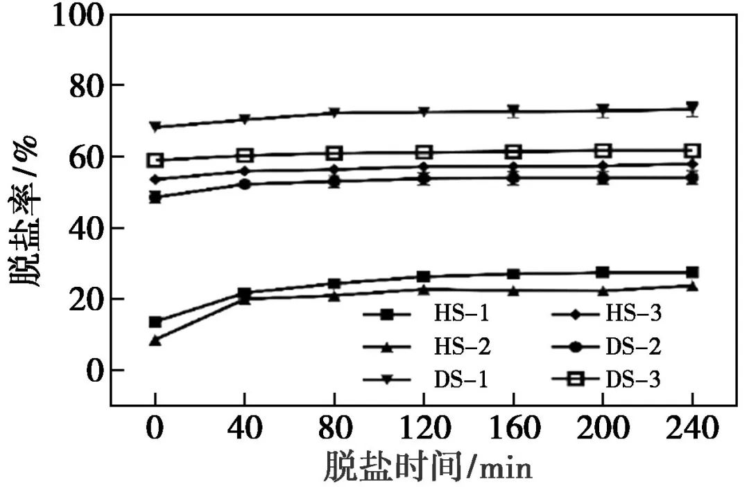 如图1与图2所示,对比不同型号树脂对发酵液脱盐率与脱色率的影响,发现弱酸性阳离子交换树脂DS-1对发酵液的脱盐效果最佳,强碱性阴离子交换树脂HS-3对发酵液的脱色效果最佳,因此,选择DS-1树脂与HS-3树脂对发酵液进行精制纯化。