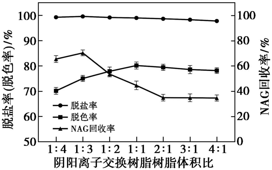 阴阳离子交换树脂体积比对发酵液精制纯化效果的影响如图3所示。