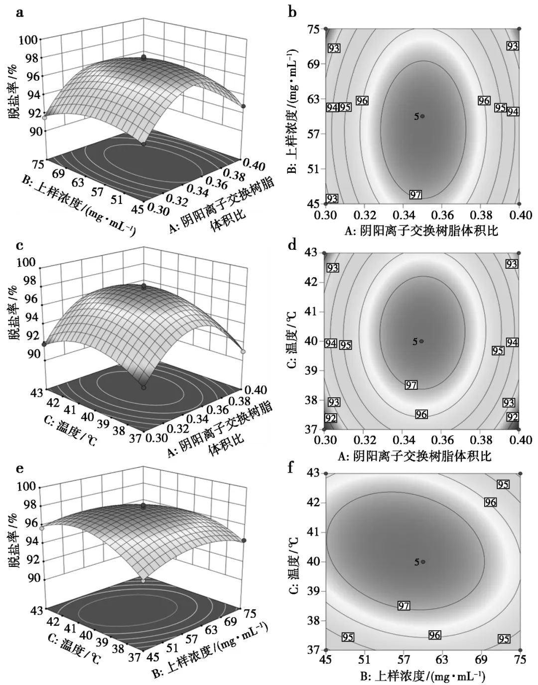 根据单因素实验结果,选择阴阳离子交换树脂体积比、上样浓度、温度为实验因素,进行三因素三水平的响应面分析实验,将温度、上样浓度、阴阳离子交换树脂体积比分别固定,发酵液脱盐率随其余2个参数变化的响应面图与等高线图如图4所示。